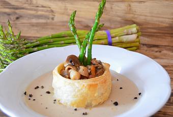 Calentamos la crema de castañas y nos disponemos a emplatar. Primero echamos en el fondo la crema de castañas, colocamos en el centro el aro de hojaldre y lo rellenamos con las setas variadas y colocamos unos espárragos verdes de pie en un lado. Rallamos un poco de trufa por encima y ya lo tenemos.