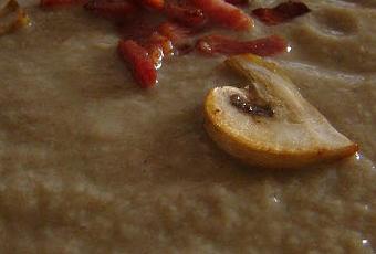 He servido la crema con las tiras de jamón y champiñón a modo de decoración.