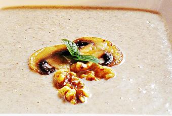 Ingredientes para 4 – 5 personas: 400 gr. de champiñones 1 puerro 2 vasos de leche 3 vasos de caldo de verduras 60 gr. de nueces 1 c/s de harina aceite de oliva virgen extra sal, pimienta negra