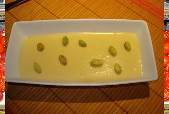 Verter la crema caliente sobre el chocolate, dejar reposar unos 2 minutos para que el chocolate funda y mezclar con un batidor para que todo se mezcle bien y quede una crema sin grumos. Poner en boles pequeños y enfriar en la nevera. A la hora de servir ponemos por encima de la crema unos pistachos bien pelados.