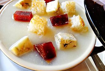 Servir la crema de coliflor con los tropezones de pan, gorgonzola y membrillo.