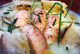 Batir todo con el minipimer, ajustar de sal y emplatar, con cebollino, miga de pan tostado y las cigalas. Yo también añadí un poco de aceite en crudo y pimienta molida.