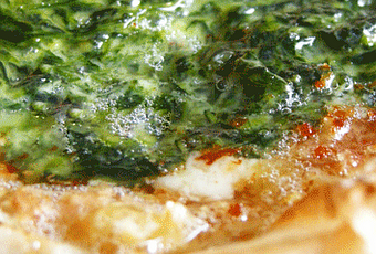 Cubrimos una cazuelita de barro con papel de hornear y colocamos la carcasa del Casar dentro de ella. Vertemos la crema de espinacas sobre la carcasa y la horneamos a 200 ºC (arriba y abajo) hasta que veamos que comienza a dorarse la superficie (esto se verá muy claramente en el reborde formado por la carcasa y no tanto en el relleno de crema de espinacas).