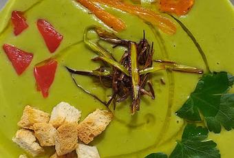 Pues hoy os presento un plato muy sencillo, contrastando el plato con el interior en mi pequeño homenaje a Andalucía y esperando, que cuando por fin se levanten todas las restricciones podáis pasaros por aqui unos días y echar un ratito bueno con los andaluces. Es una sencilla crema de guisantes pero con un poco de "rock & roll" que se lo doy con un poquito de chili en polvo, lo acompaño con unas verduritas y un poco de perejil y nos queda un plato de lo más apetitoso no sólo de sabor sino de presentación también,