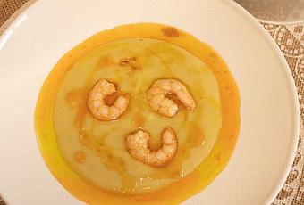 Sirve la crema caliente con las gambas, su aceite y un hilo de aceite de oliva virgen extra de cosecha temprana.