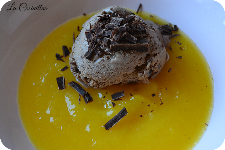 Seguimos con los postres refrescantes y es que este verano esta siendo insoportable con este calor, vamos que tengo la heladera echando humo y suplicándome unos días de descanso, estoy planteándome seriamente pagarle unas horas extras, por que la pobre mía no para jejeje.Me gusta mucho acompañar los helados con algún tipo de crema ya sea con una crema inglesa, una crema de chocolate o una simple salsa de caramelo, considero que le aportan mucho sabor y hacen de estos un autentico manjar. Esta crema de mango es ideal para acompañarla con cualquier postre que lleve chocolate, la combinación de este con el acido del mango es perfecta y realmente deliciosa, a mi me sorprendió muchísimo. Podemos elaborarla con cualquier fruta que queráis fresas, kiwis, melocotones. En fin experimentar y ya me contáis que tal el experimento, mientras os dejo con la receta y espero que os guste.INGREDIENTES (para 4 personas ):- 3 mangos.- 1 limón.- 100 ml de agua mineral.- 2 cucharadas de azúcar.- 20 g de chocolate fondant.- Helado de chocolate ( podéis ver la receta aquí ). ELABORACION:Ponemos a calentar el agua mineral en un cazo junto con el azúcar, removemos hasta que esta se disuelva por completo y dejamos enfriar.Pelamos los mangos y quitamos el hueso central, los introducimos en el vaso de la batidora, añadimos el almíbar que habíamos elaborado anteriormente y trituramos todo hasta obtener una crema.