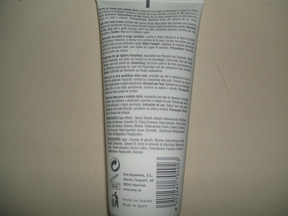 Está enriquecida con aceite de albaricoque y manteca de karité, que ayuda mejorar la elasticidad, suavidad y nutrición de la piel. Tiene una fórmula no grasa, por lo que se absorve enseguida aún siendo una crema algo densita. Es de fácil aplicación y con un poquito es más que suficiente, ya que se absorve enseguida.Esta crema es perfecta no solo para las manos sino tambien para las uñas y cutículas.