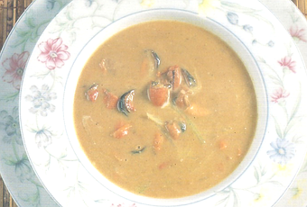 Sirve la crema de mejillones con los mejillones reservados. Espolvorea un poco de peregil