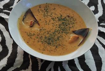 - Tritura la mezcla, pasa por el chino, añade los mejillones enteros sin cáscara (reserva alguno con cáscara para decorar) y vuelvelo a poner en el fuego hasta que hierva.