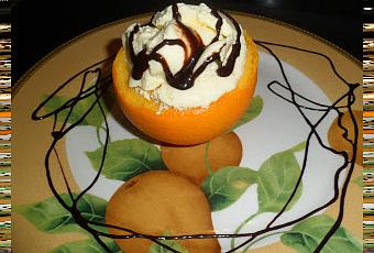 Llenamos con la crema de naranja las cortezas de naranjas que habiasmos reservado y decoramos con sirope de chocolate.