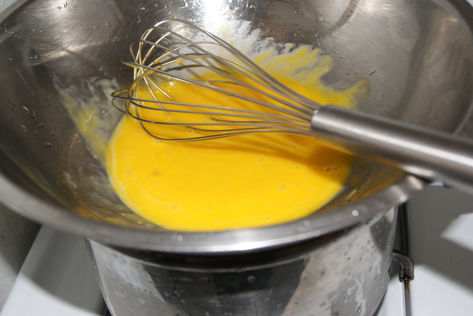 Cuando el agua este empezando a hervir ponemos el bol en baño de María. Batimos constantemente, pero previniendo que la crema haga espumas o que se convierta en huevos frito. Cuando tengamos una crema la removemos del baño de María y la vertemos en un bol. También si tenemos un termómetro de dulce lo podemos usar, la temperatura que necesitamos que la crema llegue a unos 170 grados F. Tendremos a la mano los dos envaces preparado: uno con agua fría y hielo y el otro donde verteremos la crema y la pondremos a enfríar dentro del otro envance.
