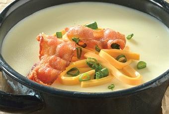 5. Sirve muy caliente, decora con el tocino, el queso y el cebollín.