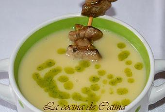 2 patatas medianas2 puerros grandes300 mililitros de leche1/2 litro de caldo de ave1/2 cucharadita de saluna pizca de pimienta negra molida1 manojo de cebollinoun vasito de aceite de oliva50 gr de champiñones
