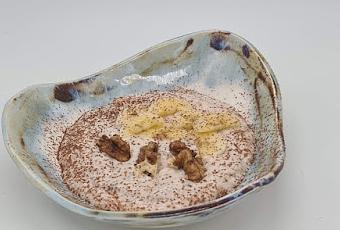 Decoración: nueces, rodajas de plátano, cacao en polvo