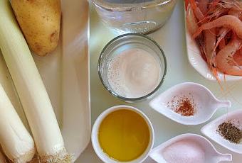 Lavamos, cortamos y pochamos la cebolleta y el puerro en el aceite a temperatura media; cuando empiecen a transparentar y antes de que cojan color, le añadimos un vaso del agua ,cocinamos durante 5 minutos y los trituramos. Añadimos entonces la patata cortada en dados, la sal, la pimienta y agregamos el agua restante. Cocemos a fuego medio-alto durante 25 minutos más y volvemos a triturar hasta tener una fina crema. Echamos la leche de almendras, la nuez moscada, mezclamos bien y retiramos del fuego. Es el momento de incorporar las gambitas que habremos pelado previamente (no tiréis las cáscaras ni cabezas pues nos servirán para la siguiente receta), dejar reposar un par de minutos y servir calentito espolvoreado con un poco de perejil seco.
