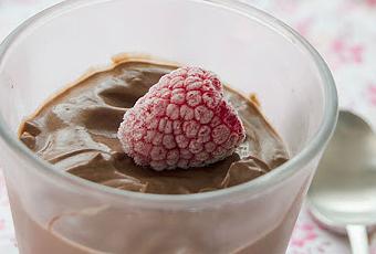 Colocar la mezcla en los vasitos y llevar a la nevera como mínimos dos horas. Decorar con frambuesas congeladas.