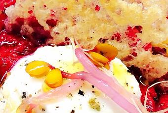 Pero a lo que vamos, también hemos picado cebolla morada, tomate, un poco de ajo y luego un toque de tomillo, albahaca, pimienta negra, sal, vinagre y a la batidora. Luego la hemos pasado por el chino para que nos quede finita, emplatamos en plan coqueto y a la mesa.