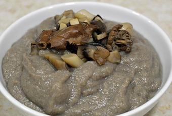 Apartamos una cucharada de setas y trituramos el resto en una batidora. Añadimos la leche de avena hasta conseguir la consistencia deseada.