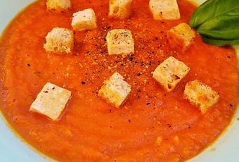 - Servimos la crema con dados de tofu y picatostes encima.