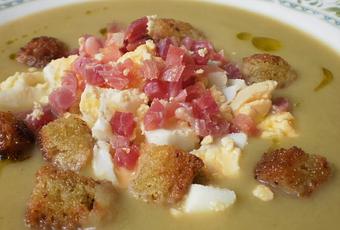 Al servir, bien caliente, añadir el huevo, el jamón, el pan frito y regar con unas gotitas de aceite de oliva virgen extra (a ser posible malagueño).