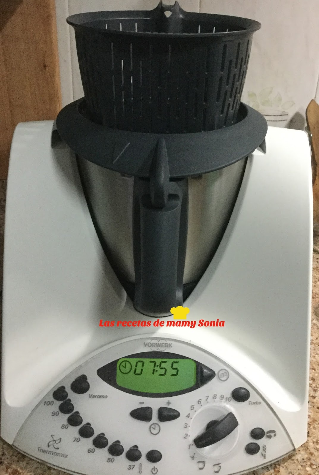 2.- Bajamos lo que haya quedado en las paredes y Programamos 8 minutos, Varoma, Vel 1. No pongas el cubilete, en su lugar coloca el cestillo sobre la tapa.