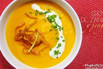 Para emplatar, servimos la crema en un bol, añadimos las tiras fritas de zanahoria y jengibre y terminamos con un poco de yogur mezclado con jengibre en polvo. Espolvoreamos cebollino picado y listo. ¡Que aproveche, hitchcookian@s!