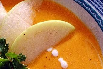 Pelamos y troceamos las zanahorias, la cebolla, las manzanas y el tallo de apio y las rehogamos en una olla con un poco de aceite durante 10 minutos,agregamos la maicena disuelta en un poco de agua fría e incorporamos el caldo vegetal hirviendo. Dejamos cocer unos 20 minutos aproximad amente hasta que la zanahoria este tierna y vamos moviendo de vez en cuando.