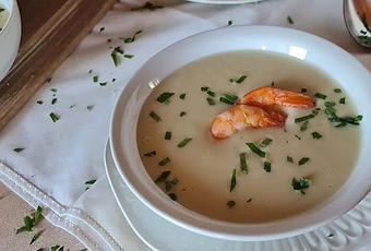 - Un poco antes de consumir la sopa, preparamos los langostinos con la receta de langostinos exprés que os dejo más abajo. También pueden ponerse cocidos o a la plancha, eso va a gusto del consumidor. Le queda muy bien también el pescado marinado.