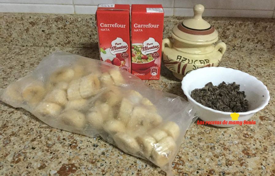 Con la ayuda de una batidora glaseamos el azúcar. Trituramos los plátanos junto con el azúcar glass, hasta hacerlos puré. Añadimos la nata y las mezclamos bien, acontinuación agregamos el chocolate y volvemos a mezclar hasta que este todo bien integrado.