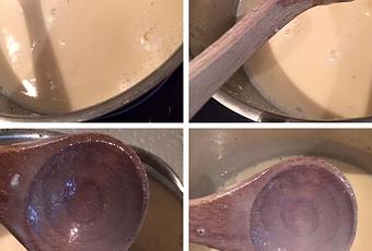 La crema inglesa no necesita ni maicena ni harina, la crema inglesa es ligera y no una “crema”. Para saber cuando esta lista, tienes que notar que el líquido deja de transparentarse en la cuchara (como en la foto). Eso pasa justo antes que hierva.