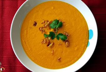 Preparación: Pelar la calabaza, el boniato y la zanahoria y cortar en trozos. En una cacerola poner un fondo de aceite a calentar y rehogar a fuego suave las verduras junto con el ajo, el jengibre y la cúrcuma. Añadir el agua y el dado de caldo y cocinar durante 30 minutos.