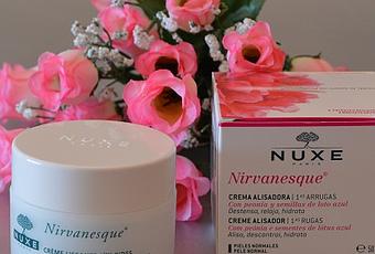 Y tras esta introducción volvemos a la crema “Nirvanesque” de NUXE.Descripción del producto:La crema “Nirvanesque” de NUXE pertenece a la gama NIRVANESQUE de cuidados hidratantes que alisan las primeras arrugas, gracias a una doble acción relajante y de distensión. Estos productos reducen y eliminan las arrugas más visibles y las que comienzan a hacer su aparición por signos de la edad o las causadas por agentes externos como el sol o la contaminación. Dentro de esta línea de productos encontramos la crema “Nirvanesque” indicada para pieles normales, la crema “Nirvanesque Enrichie” indicada para pieles secas y muy secas, la crema “Nirvanesque Light” indicada para pieles mixtas y el contorno de ojos “Nirvanesque Yeux”. Yo voy a hablar sobre el primer producto.