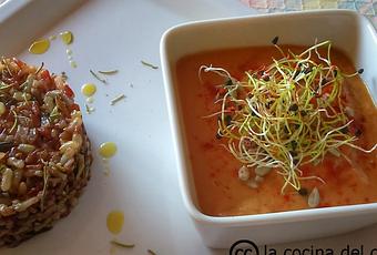 Para preparar la crema, ponemos en el vaso de la batidora los tomates, el aguacate, los tomates secos, el aceite de oliva, el vinagre, la albahaca, el perejil, el orégano y un poquito de agua de mar. Trituramos y ajustamos la consistencia con agua filtrada. Nos tiene que quedar una mezcla homogénea. La servimos en cuencos y decoramos con unas semillas de girasol, pimentón y germinados.