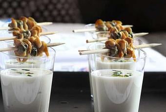 - Servimos la crema tibia en vasitos individuales, decoramos con unas gotas de aceite de oliva virgen extra y cebollino picado y colocamos encima un palillo con los berberechos.