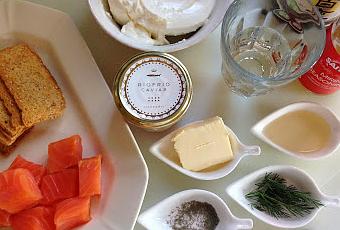 Para montar las tostas, sobre cada una formamos una especie de S con la crema y en un extremo colocamos un taquito de salmón y en el otro una cucharadita de huevas decoradas con un poquitín de eneldo.