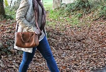 Llevo jeans básicos, sweater de ochos en marrón con camisa por debajo, botines marrones y mi nuevo abrigo en color crema con mangas polipiel y el resto de peluche (super abrigoso, pues hacía un frío que se quedaba congelado uno haciendo las fotos...jeje). Como complementos bolso tote marrón y fular del mismo tono y con motivos de animales de fondo.