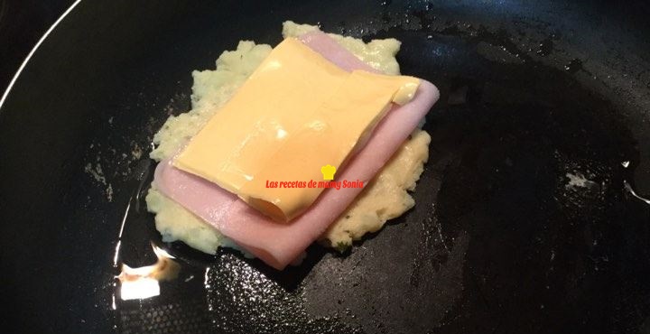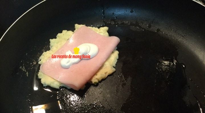 Y sobre esta otra loncha de jamón de york y cubrimos con otra tortita hecha con lamasa de patata