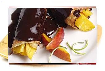 Colocar todos los ingredientes de la masa a crepes en el envase de la licuadora, mezclar bien, colar, descansar 30 mn. en la nevera. Luego, fabricar las crepes de forma convencional. Preparar la salsa de chocolate llevando a nivel de ebullición todos sus componentes, reservar. Sacar el jugo de las naranjas, agregarle la mantequilla y el azúcar de la guarnición, y reducir hasta obtener la mitad del liquido, en este, se carameliza el mango cortado en cuadritos pequeños. Rellenar las crepes con la preparación de mango, cerrarlas, y bañarlas con la salsa de chocolate.Fuente: Recetas