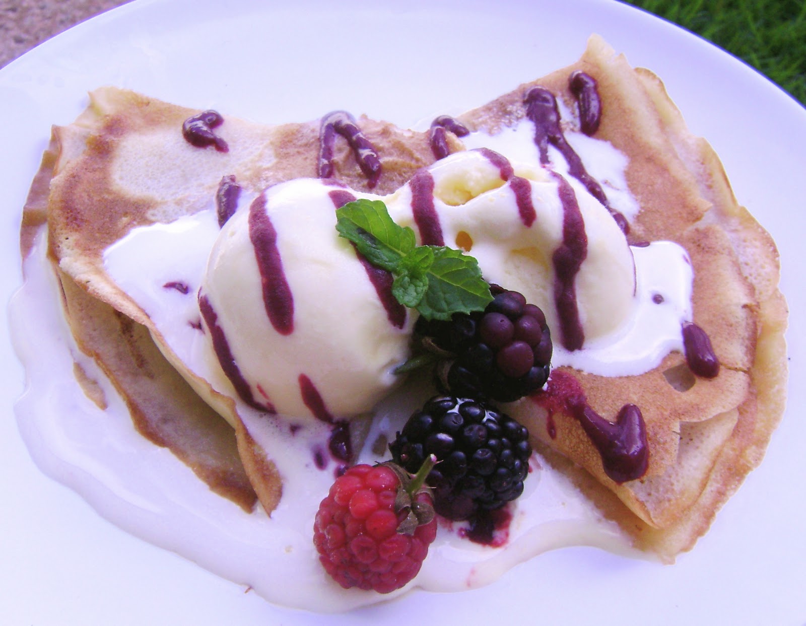 6. En un sartén, derrite la mantequilla con el jugo de naranja. Pon 4 crepes doblados en 4 sobre este líquido y añade el licor. Cuidadosamente, flamea los crepes. En el plato de servir, pon dos crepes, helado, coulis de mora y moras frescas. Sirve inmediatamente.