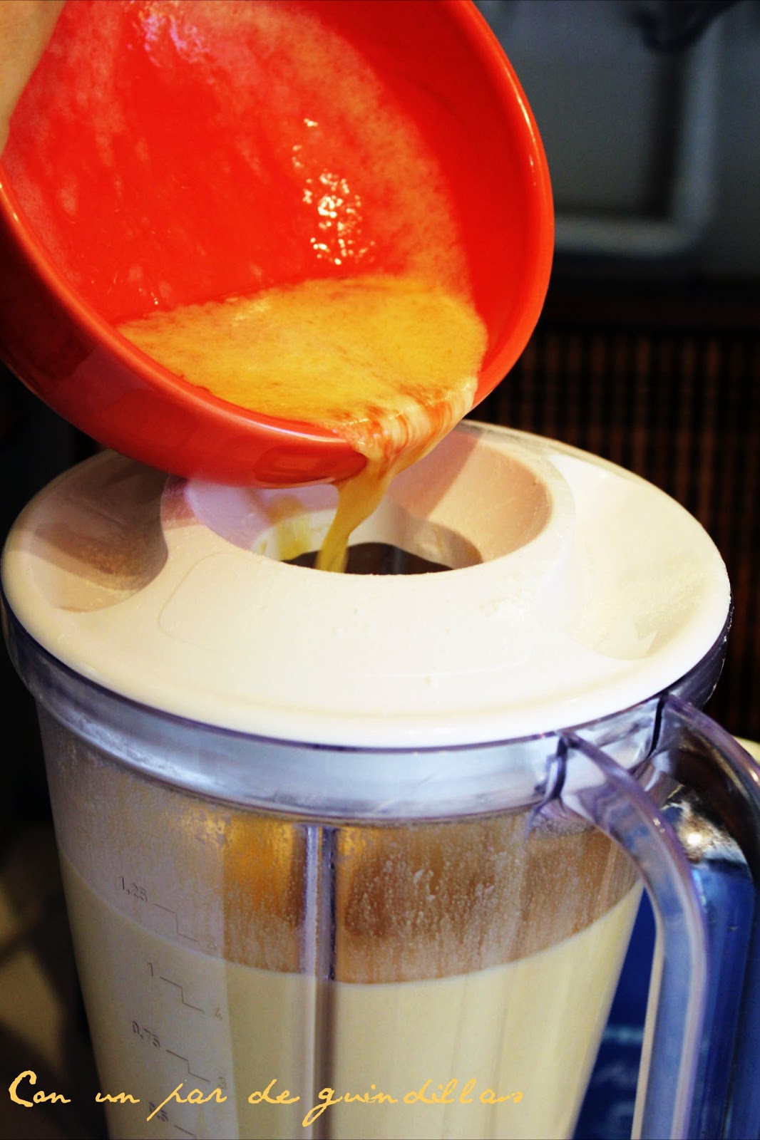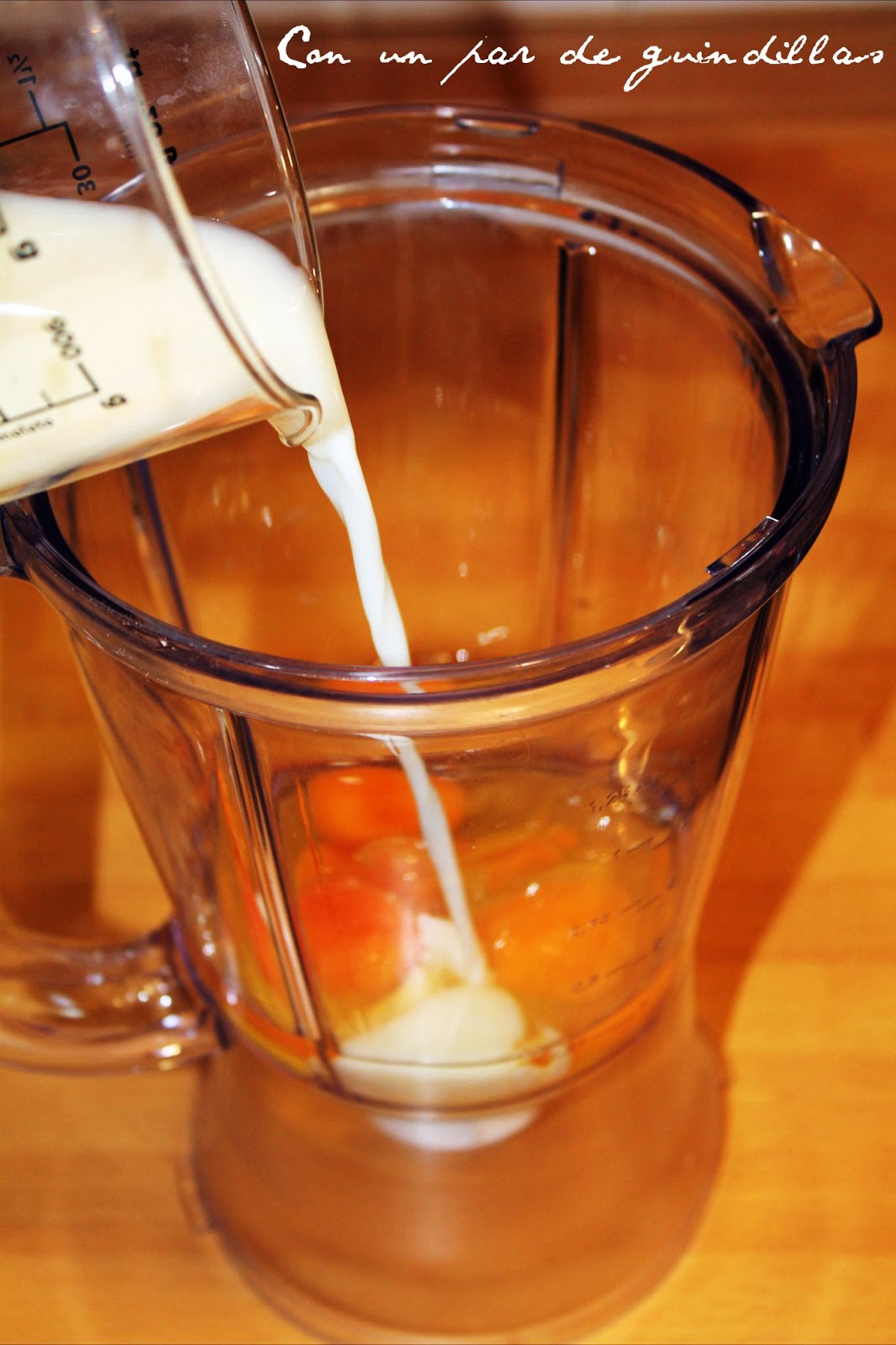 1.- Ponemos la leche, el agua, los huevos y la sal en el vaso de la batidora. Batimos unos segundos y vamos añadiendo, cucharada a cucharada, la harina tamizada.