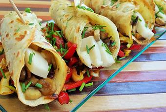 - En el centro de cada crepe colocamos el relleno de los champiñones y varios taquitos de queso. Enrollamos las crepes y fijamos con un palillo.