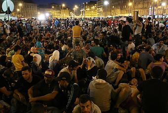 La situación no me gusta nada, porque esto tiene muy mala pinta: los inmigrantes no aceptan solicitar el asilo en Hungría, solo piensan en tomar los trenes a Alemania, y mientras no les dejen van a seguir acumulándose, porque no paran de llegar. Así que me temo que, o les dejan marchar, o esto va a terminar en una gran carga policial cuando se caldeen los ánimos. Y no quiero imaginar qué puede ocurrir como la extrema derecha haga acto de presencia. Esperemos que la diplomacia pueda resolver este problema. Os dejo unas fotografías de esta misma noche que publica el diario húngaro Index de las inmediaciones de la estación de Keleti, en Budapest (plaza Baross):
