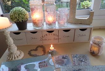 Unas puntillas pegadas con silicona y nada más.El dia está oscuro y me ha venido fenomenal para hacer las fotos con las velitas encendidas