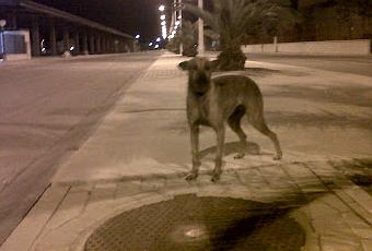 Es una raterita de alrededor de 1.5 años, unos 7 kg y unos 35 cm de cruz, muy tierna y simpatica y graciosa......la echaron de un coche este invierno, según nos ha comentado el de seguridad, con su collarcito y todo y alli vive...