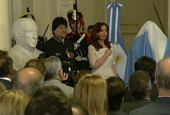 Casa Rosada. La Primer mandataria Cristina Kirchner deja el gobierno en un acto solemne que reunió a funcionarios en la sala donde culmina 12 años de gobierno. Ante la presencia del mandatario Evo Morales, Presidente de Bolivia, los granaderos a sus espaldas dejó al descubierto una estatua del ex presidente fallecido Nestor Kirchner. "La historia no se escribe con regla, escuadra y compás". "La historia de los pueblos está vibrante siempre por la lucha de la emancipación". "Integrarse al mundo como defensa de Nación", expresó la mandataria ante los aplausos de los militantes.También refirió a la Justicia, contraposición con el gobierno entrante. Dijo:" cuando habían acatado conflictos religiosos, de repente los que antes eran enemigos hoy ya no son enemigos, combaten contra otros enemigos".