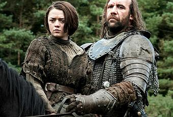 En el viaje de el Perro y Arya Stark se encuentran con un viejo que intenta arreglar un carro donde lleva mercancía porcuna por sus propios medios. Sandor le ayuda (con una fuerza sobrehumana) a montar el carro, pero sólo para dejarle inconsciente después, pues quiere usar el carro y su mercancía para infiltrarse en la boda en los Gemelos. Cuando le va a matar, Arya interviene y le ruega que no lo haga. Aquí se debate un duelo de miradas. La fuerza interior de Arya es enorme, lo cual le da que pensar a Sandor y tal es así que realmente se lo replantea y aunque podría apartar a la niña y matarlo no lo hace: sabe que la que tiene enfrente es muy poderosa. De hecho, al final de la escena podemos percibir cierto asombro apareciendo por la deforme cara del Perro contemplando a Arya marcharse.