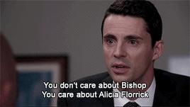 Por otro lado, tenemos a Cary en uno de los momentos más bajos de su vida, donde su libertad corre un serio peligro. Me estoy viendo que ya no saben qué sacarle más al muchacho para que lo metan en la cárcel. ¿Qué será lo próximo, Castro, que no cambia las sábanas? Ahora se le acusa de haber robado dos kilos de cocaína en un caso contra Bishop mientras estaba a la orden de Peter Florrick. Y parece que llevaban más o menos razón. Cary rompió las reglas pero por una razón fundamental: su jefe. Agos es tan buena persona que decide tragarse la mierda que le está trayendo este asunto con tal de no perjudicar al gobernador. ¡Qué mono! ¿Pero sabéis quién no es tan mono sino un hijo de la gran puta? Sí, habéis acertado, Peter Florrick. Ramona – que no tiene dos cántaros por pecho – ha sido la culpable de que el trabajo de Cary para su exjefe quede en nada al aconsejarle a Peter que ni se presente a declarar. ¡Lo que me faltaba ya! ¿Y cuándo decís que puedo encargarle a Colin Sweeney o a alguno de los secuaces de Bishop que se cargue a Florrick? Creo que no puede haber un ser más despreciable en esta serie que Peter. Ah, no, que también está Castro. El otro gran bastardo de esta serie está obcecado en seguir culpando a Agos de cualquier minucia que haya para que le entregue a Bishop en vez de ir por el rey de las drogas directamente, sobre todo si tenemos en cuenta que Kalinda ha encontrado al testigo desaparecido, Trey, y está dispuesto a testificar contra su jefe. Menos mal que Finn se ha dado cuenta de las intenciones del maldito calvo y ha decidido cortar por lo sano: dimitiendo. Espero dejar de odiar a Finn esta temporada porque estaba de un tocapelotas importante, aunque se ha ganado cierto cariño al contarle por encima a Alicia acerca de la reunión con Castro. Ese ha sido un gran toque junto con la propuesta de esta sobre el espacio para oficinas. ¿Por qué no contratar a Finn Polmar y utilizar la información que tiene sobre la oficina del fiscal a favor de Florrick, Agos & Lockhart? Yo lo veo una buena idea.