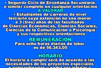 CONDICIONES DE TRABAJOa) Carga Horaria: El horario a cumplir será de acuerdo a las necesidades de los proyectos especiales o extraordinarios y podrá ser inferior a ocho horas diarias de labor de lunes a viernesb) Remuneración Propuesta: Para ocho horas diarias de labor es de 56.343,05, a valores enero 2023 y en caso de que el horario de labor sea inferior a ocho horas diarias se hará el prorrateo correspondienteLos ajustes salariales se realizaran de acuerdo a lo que determine oportunamente el Poder Ejecutivo para funcionarios públicos.