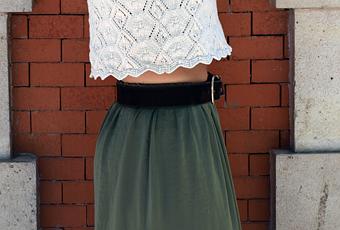 Un look muy sencillo, pero que a mi me encanta. Una falda larga, un básico que sólo concibo en verano, en verde Kaki que ofrece infinitas combinaciones.El top de hoy es la prenda estrella. De mi madre a mi tía, para finalmente pasar a mis manos. Una auténtica joyita que recoge dos de las grandes tendencias veraniega, un crop-top en crochet. ¡¿Cómo es?¡ Yo estoy IN LOVE total.