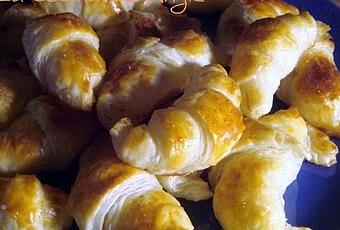 - Cortar el hojaldre en triángulos, poner una cdta. de relleno en la base de cada uno, y cerrar enrollando; dar forma de croissant y poner en la fuente del horno sobre papel vegetal. Pintar con huevo batido y hornear a 180º durante unos 15´, hasta que se doren.